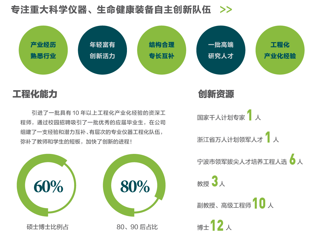 華儀寧創(chuàng)打造了一支專注于高端智能儀器裝備自主創(chuàng)新、成果轉(zhuǎn)化和產(chǎn)業(yè)化、國(guó)內(nèi)一流、具有國(guó)際競(jìng)爭(zhēng)力的創(chuàng)新創(chuàng)業(yè)隊(duì)伍。團(tuán)隊(duì)結(jié)構(gòu)合理,涵蓋重大前沿技術(shù)創(chuàng)新、技術(shù)實(shí)現(xiàn)、工程化、應(yīng)用開發(fā)、市場(chǎng)推廣等環(huán)節(jié)。公司有一大批具有10年以上高端儀器裝備工程化產(chǎn)業(yè)化經(jīng)驗(yàn)的資深工程專家,掌握一套從技術(shù)到產(chǎn)品實(shí)現(xiàn)的創(chuàng)新方法,能保障順利的實(shí)現(xiàn)從新產(chǎn)品研發(fā)到產(chǎn)品量產(chǎn)。公司擁有國(guó)家級(jí)引才計(jì)劃人才,浙江省引才計(jì)劃人才、寧波市領(lǐng)軍拔尖人才等高層次領(lǐng)軍人才等高層次領(lǐng)軍人才和一批擁有豐富工程化經(jīng)驗(yàn)的工程專家,研發(fā)人員碩士博士比例近60%。