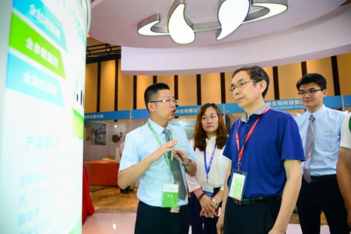 第二軍醫(yī)大學(xué)生物醫(yī)學(xué)工程研究所所長(zhǎng)、再生醫(yī)學(xué)研究中心主任張傳森教授參觀展臺(tái)
