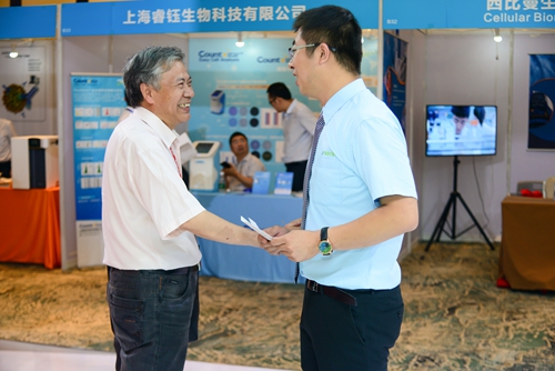 同濟(jì)大學(xué)醫(yī)學(xué)院院長(zhǎng)、華東干細(xì)胞庫(kù)主任徐國(guó)彤教授與國(guó)家青年“千人計(jì)劃”專家同濟(jì)大學(xué)左為教授參觀展臺(tái)