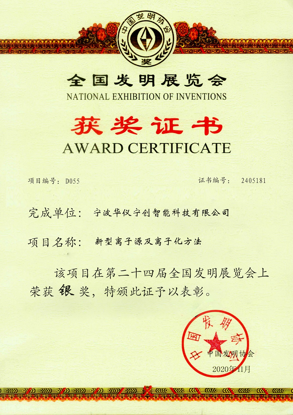 2020年11月21日,為期3天的第二十四屆全國發(fā)明展覽會(huì)——一帶一路暨金磚國家技能發(fā)展與技術(shù)創(chuàng)新大賽在佛山閉幕。寧波華儀寧創(chuàng)智能科技有限公司參展發(fā)明專利“新型離子源及離子化方法”獲得本屆“發(fā)明創(chuàng)業(yè)獎(jiǎng)”銀獎(jiǎng)。